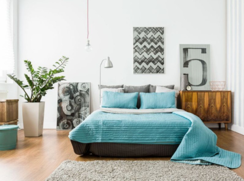 Bold, abstract art can easily transform a bedroom, and it doesn’t have to break the bank. Picture: Getty