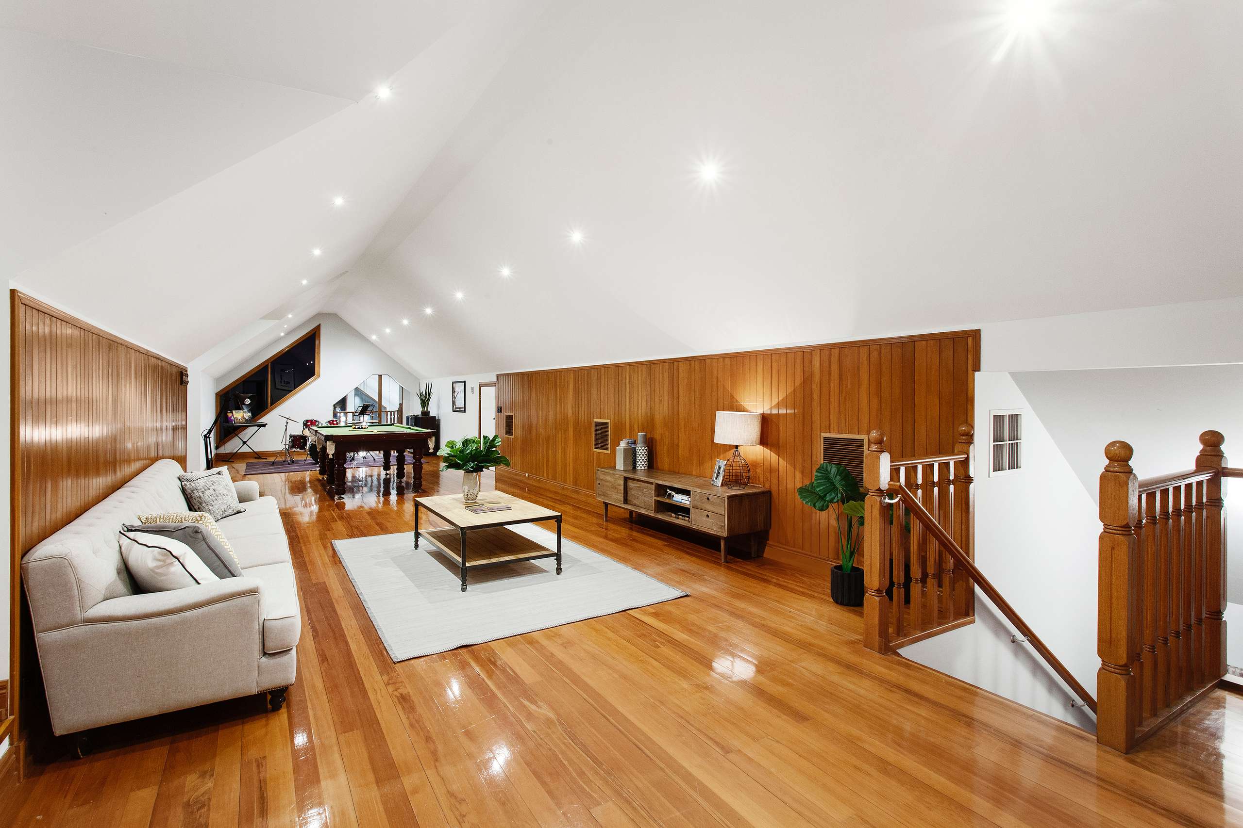 Upstairs has a huge warehouse style rumpus room with flexible space presently used as a sitting room, games and music area and a study nook with cathedral ceilings and glorious treetop views. A 4th bedroom (window seat) is serviced by its own bathroom on this floor.