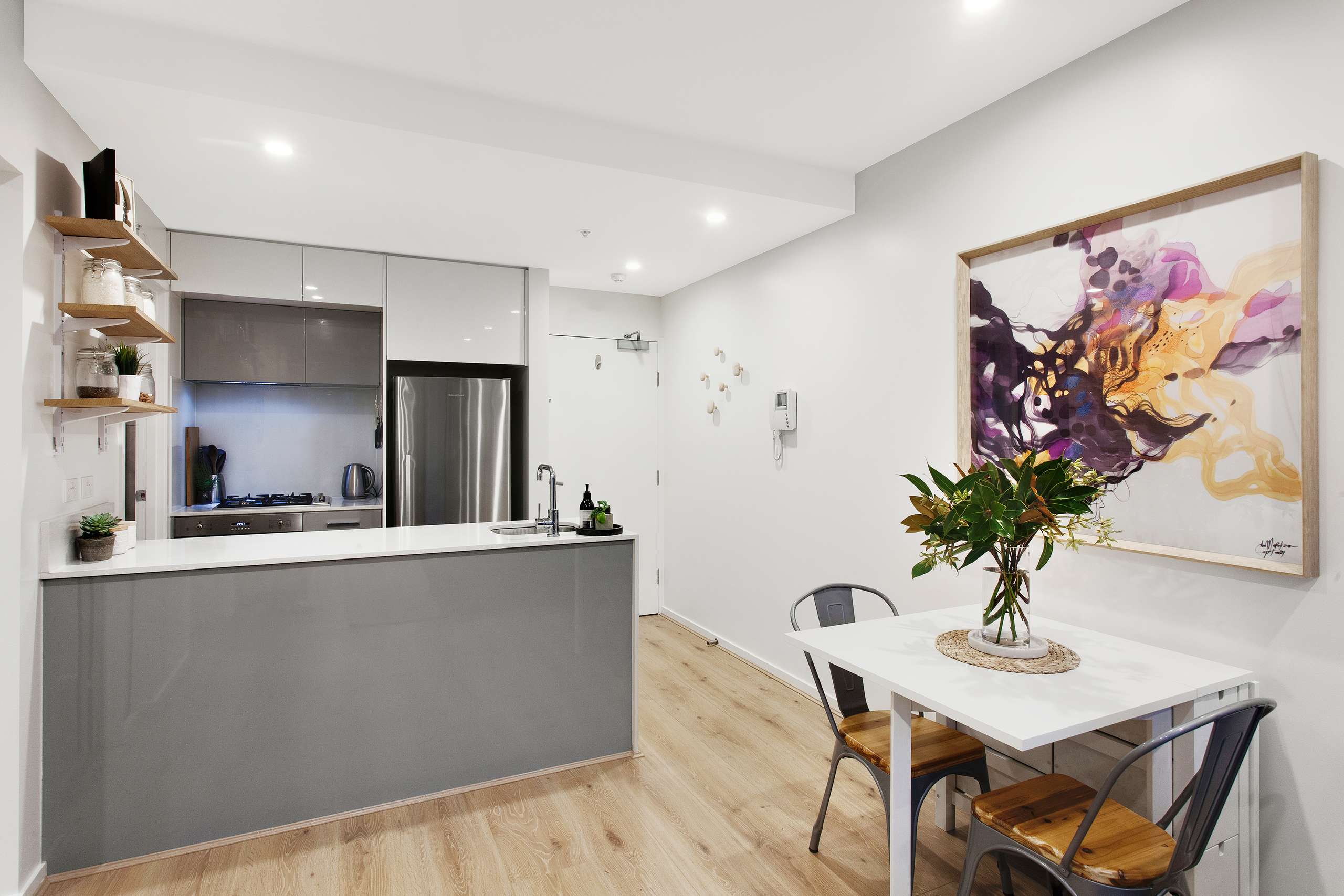 Using wooden highlights from the whitewashed European Oak floors and open shelves to the designer coat hooks, this chic retreat features a savvy stone kitchen (Smeg appliances & Fisher and Paykel dish drawer) with casual living & dining area and covered balcony taking in the lovely leafy views; 2 double bedrooms (main with BIRs) and a radiant bathroom (European laundry).