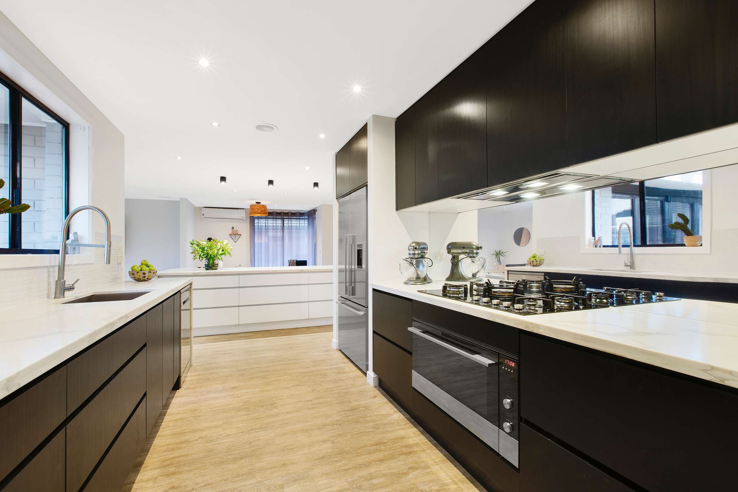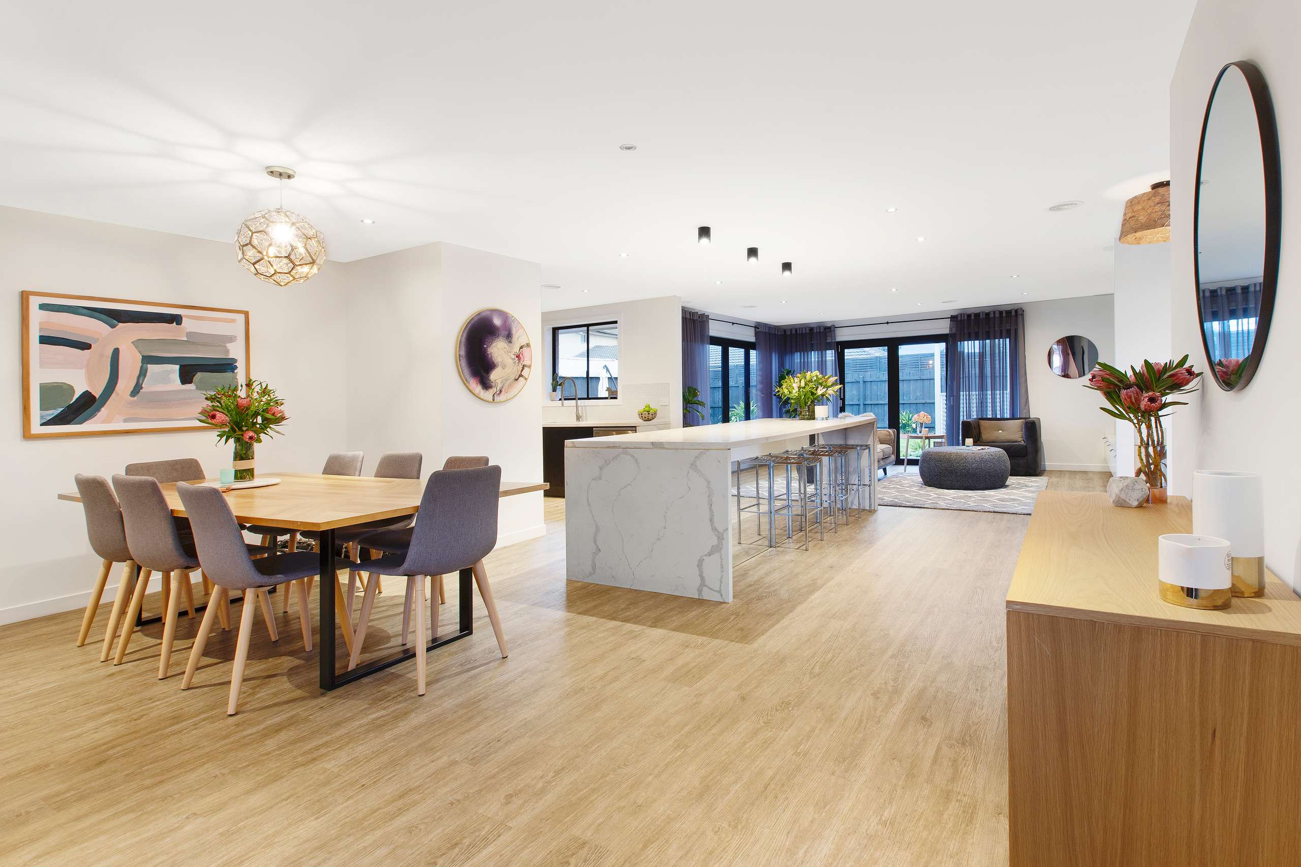 Dazzling with designer lighting, beautiful sheer drapes and a stunning marble look island bench that takes centre stage of the entertaining, this lavish abode showcases an amazing open plan entertaining area incorporating a place to dine, a place to study and a north facing living area with built in A/V cabinetry; the impressive stone kitchen with Fisher & Paykel 900mm appliances and a combined butler’s pantry/laundry; 3 sumptuous bedrooms (WIR/BIRs) and 2 stunning bathrooms (double shower ensuite).