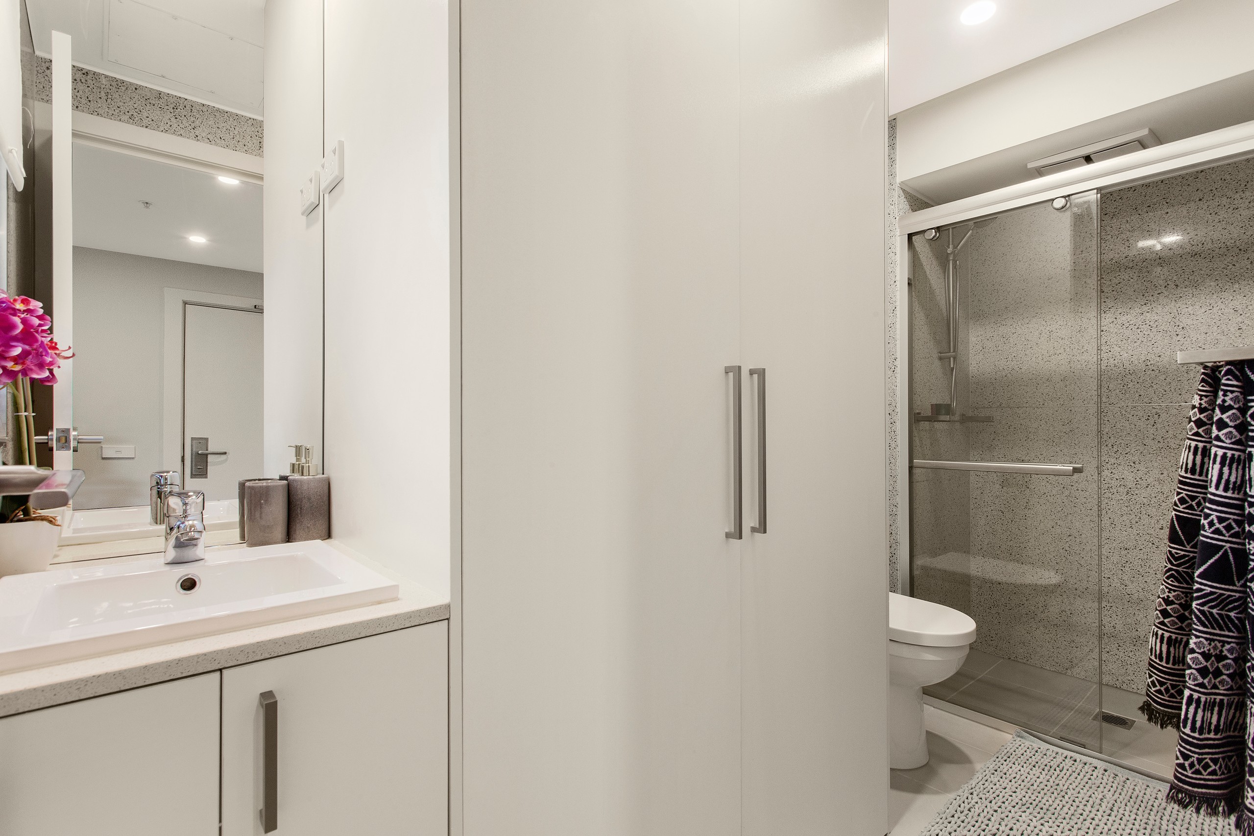 Well designed with its angled bedroom (BIRs), stylish open plan living with vogue stone kitchen opening to a north facing covered balcony and a stunning bathroom fully panelled in terrazzo style Caesarstone and featuring a European laundry.