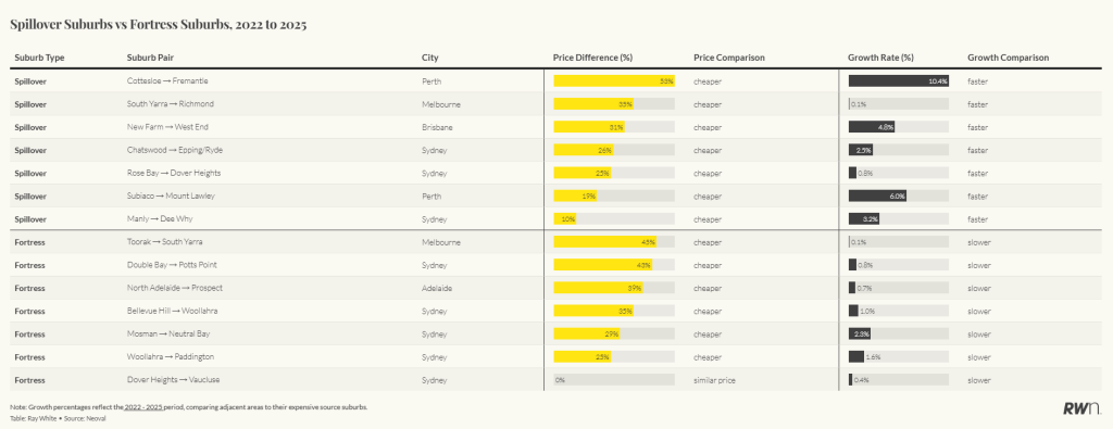 Note: Growth percentages reflect the 2022 – 2025 period, comparing adjacent areas to their expensive source suburbs.