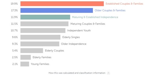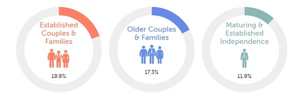 Established Couples & Families make up the largest percentage of people living in Bentleigh followed by Older Couples & Families and Maturing & Established Independence.