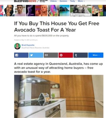 Cameron earned himself no less than 77 news items in the space 3 days after he published an ad for two off the plan townhouses that he was selling that came with free avocado on toast at any local coffee shop in Sherwood for a year. He excited millennials all over the world.